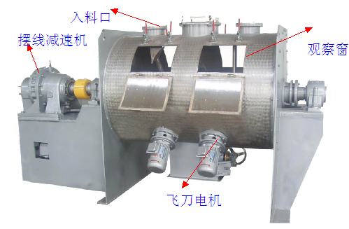 臥式犁刀混合機(jī)啟動后犁刀由犁刀軸帶動旋轉(zhuǎn),使物料沿筒體徑向作周向湍動,同時把物料沿犁刀兩側(cè)面的法線方向拋出。當(dāng)被拋出和作周向湍動的物料流經(jīng)飛刀組時,被高速旋轉(zhuǎn)的飛刀迅速、有力地拋散。物料在上述犁刀和飛刀的復(fù)合作用下,不斷疊、擴(kuò)散、在短時間內(nèi)達(dá)到均勻混合,混合精度高。